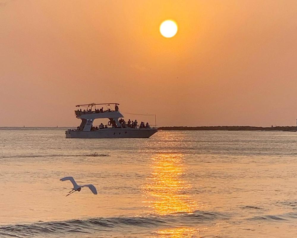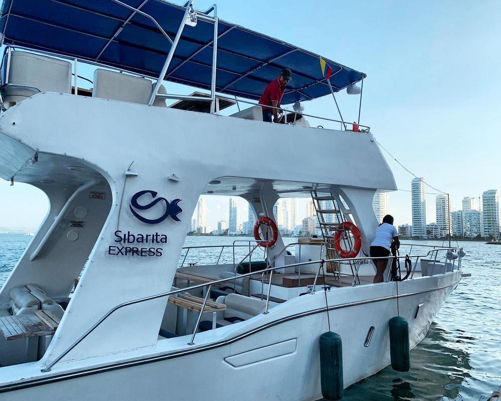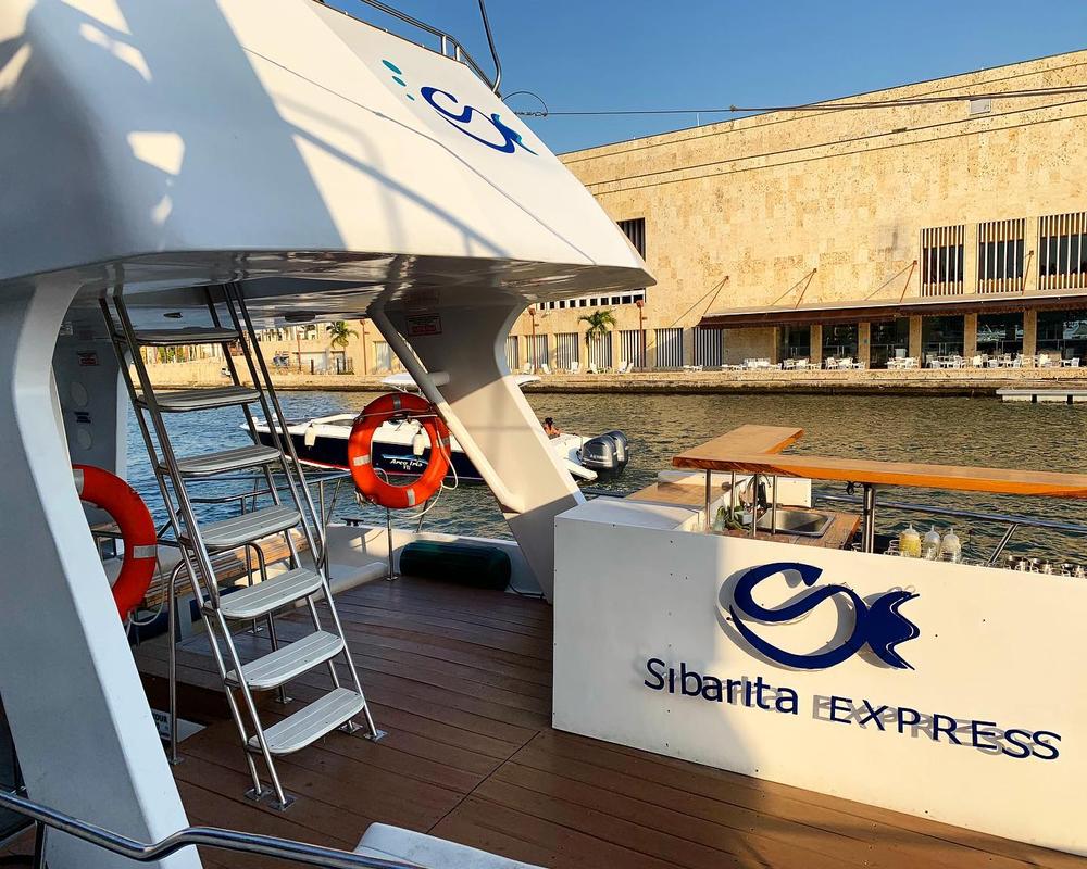 At Sunset by the bay in Sibarita Express we left the Bodeguita pier, front of the walled city of Cartagena. We sail between the Manga and Bocagrande skyscrapers. Later, we sail between Isla Manzanillo and Castillo Grande. We arrived in front of El Laguito and the Tierra Bomba island, where the bay opens to the sea. Here we enjoy the magnificent sunset as we sail silently Little by little the lights of the skyscrapers are lighting up.
